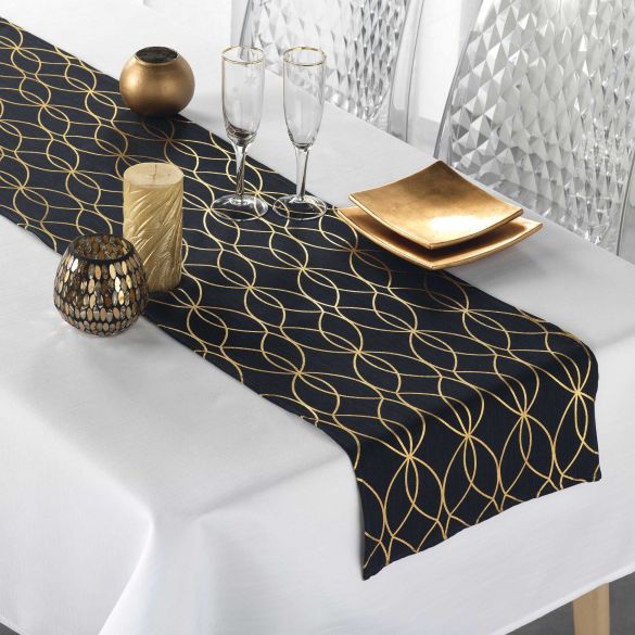 Nappe antitache rectangle 140 x 250 cm blanche unie + chemin de table 35 x 140 cm noir avec motifs graphiques dorés